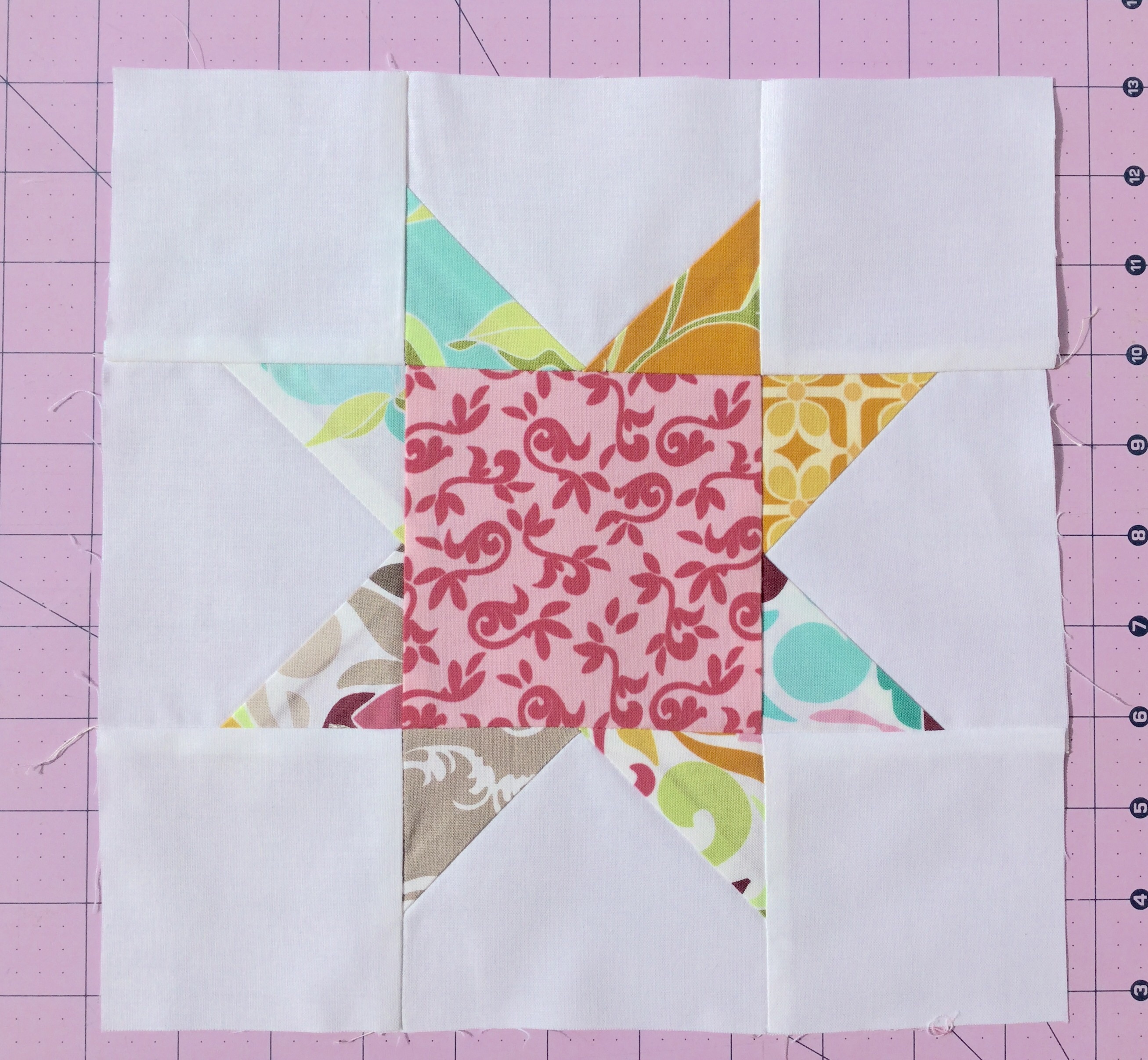 Trim the block using your rotary cutter and ruler to the 9-1/2″ square.