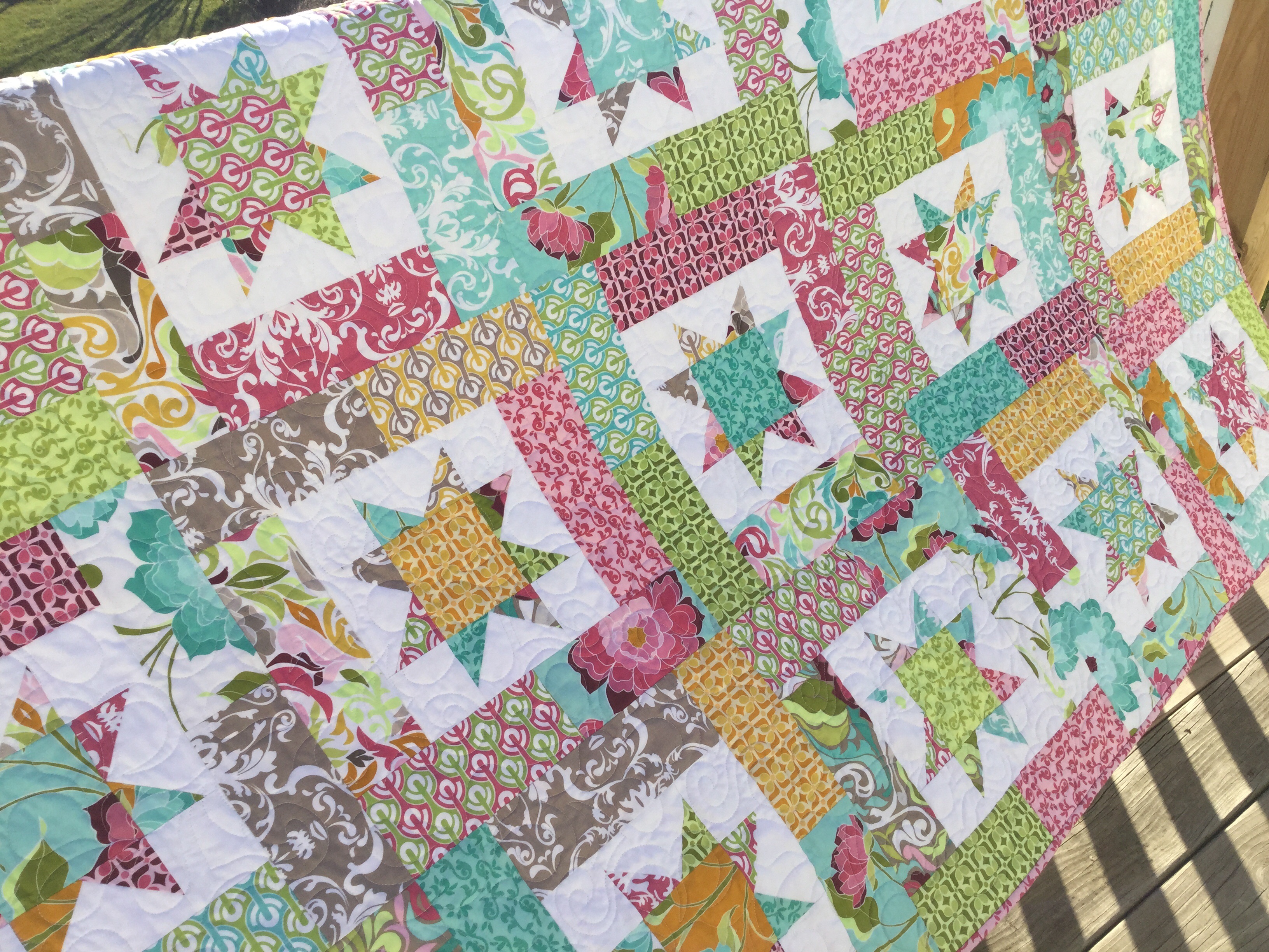 I used the quilt pattern from Atkinson Designs called Lucky Stars. You can’t go wrong with this one ya’ll. It’s so versatile. All you need is some background fabric and a bunch of beautiful fat quarters!