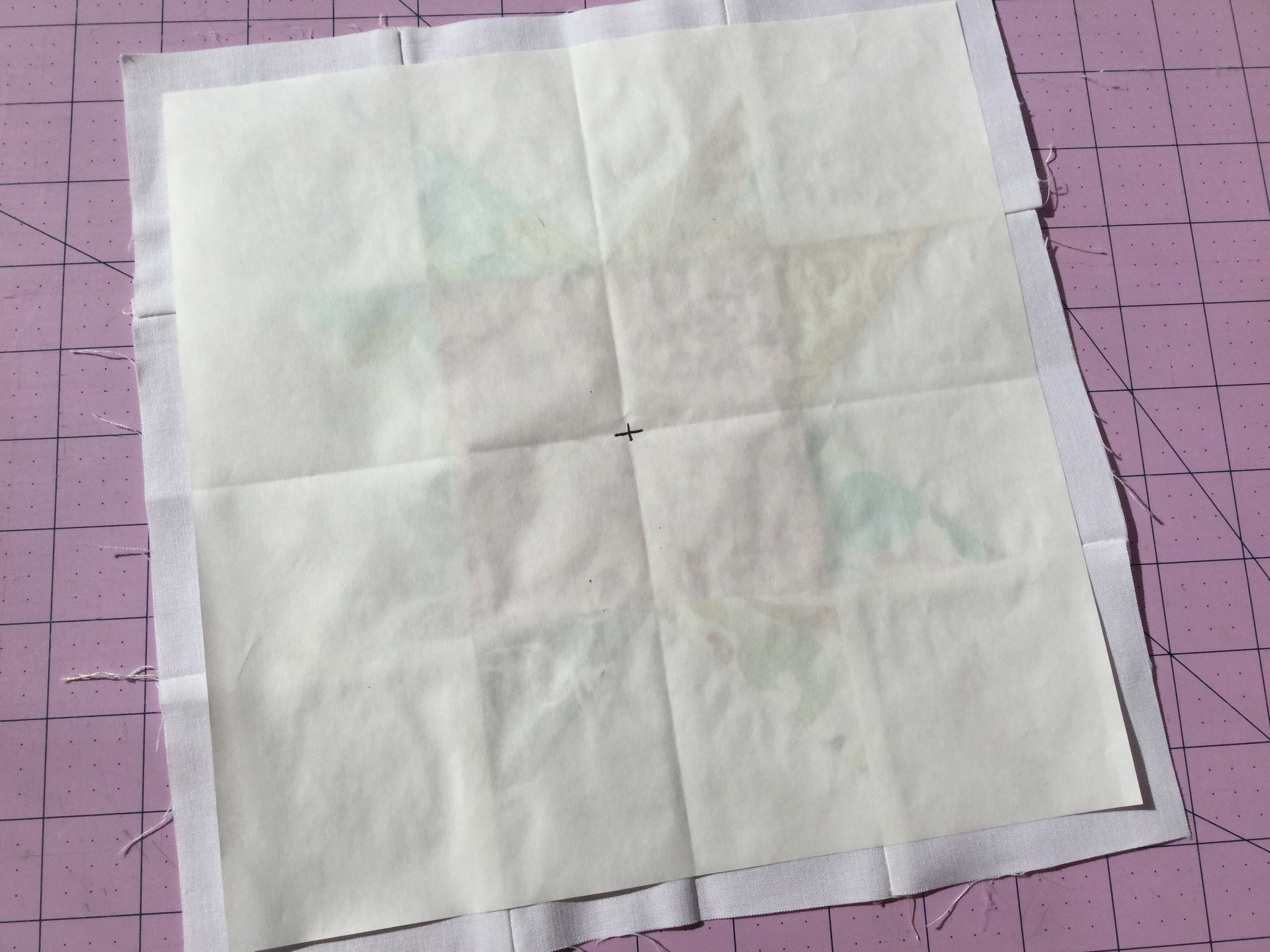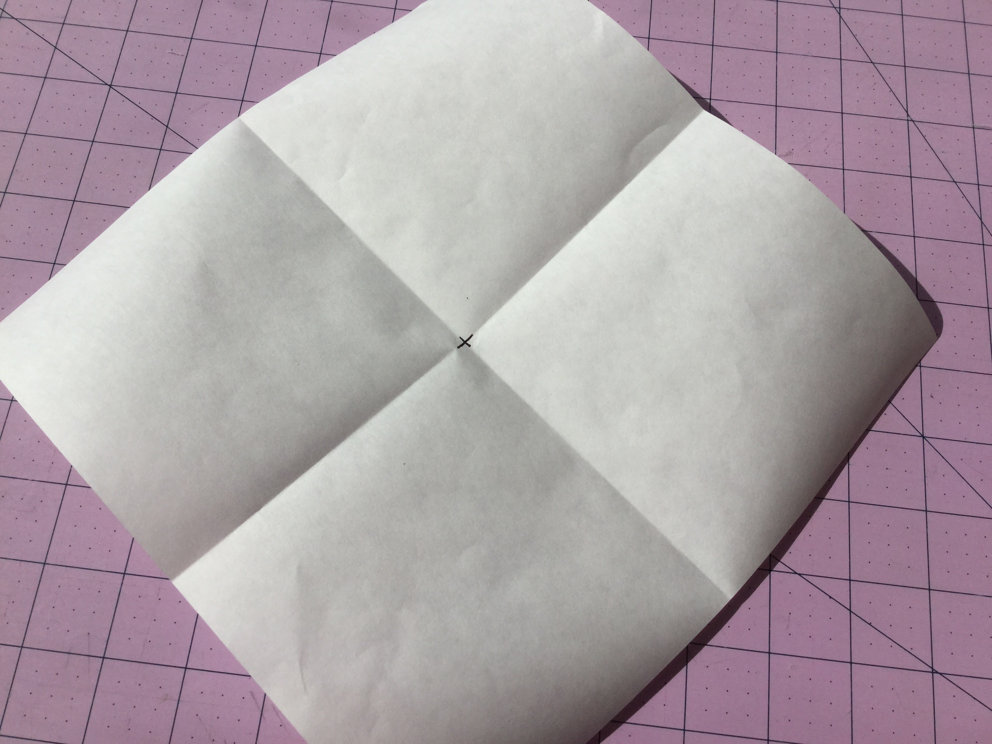 Start by cutting a 9-1/2″ square from freezer paper, fold it into fourths and mark the center with a x.