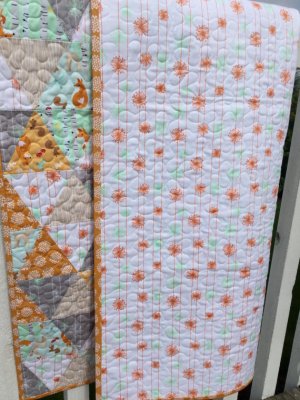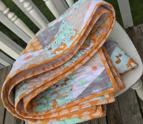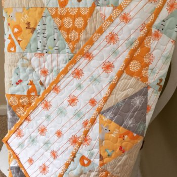 I wrote this ‘little‘ tutorial for a new baby quilt KIT for the shop using equilateral triangles and Riley Blake’s fabric line called ‘Good Natured”. It really is a sweet quilt with the orange & mint…adorable nature friends… squirrels, baby deer, sweet little bluebirds and playful foxes among birch trees!