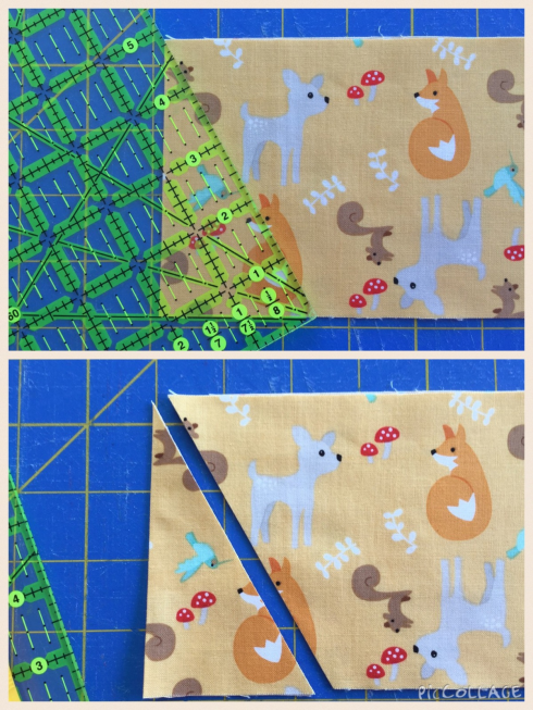 I do have a a tip & short cut on trimming your blocks down to size. Trimming for me is so cumbersome and it never fails…I always screw up at least one block trying to figure out how to trim without having a lopsided block!