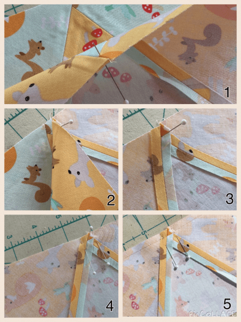 1. Place triangle 1 & 2 of the first row right sides together, matching up the top and all the edges.