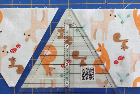Place the ruler on the strip of fabric. The 4-1/4” mark should line up with the bottom of the strip and the squared off tip of the triangle should line up with the top of the strip.