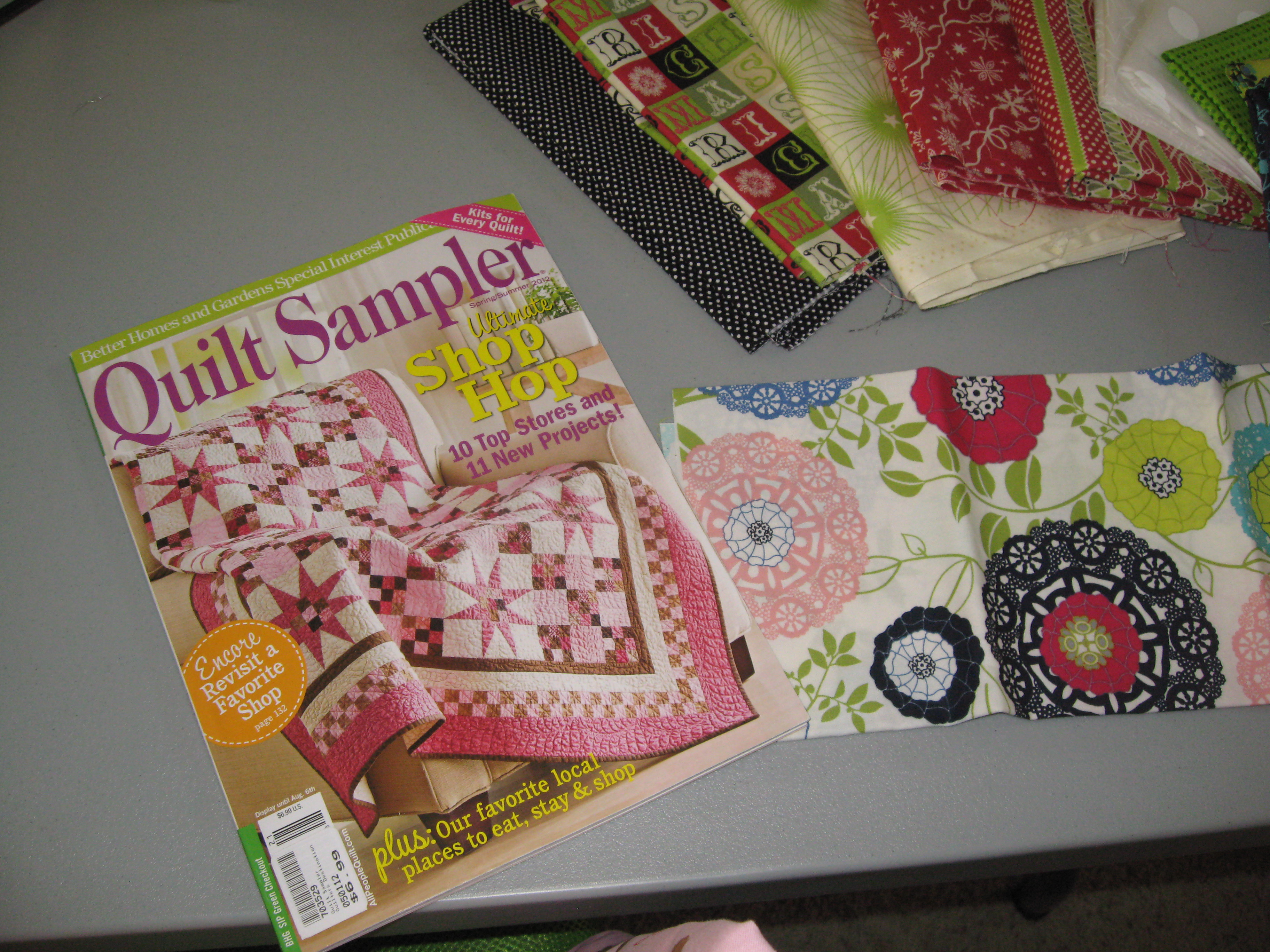 If you’re dyin’ to go on a shop hop but can’t find the time, pick up the new spring 2012 issue of Quilt Sampler for the top 10 shops to visit. This is my favorite magazine. Lots of interesting stories about how the shops get started, free projects and eye candy to keep you entertained.