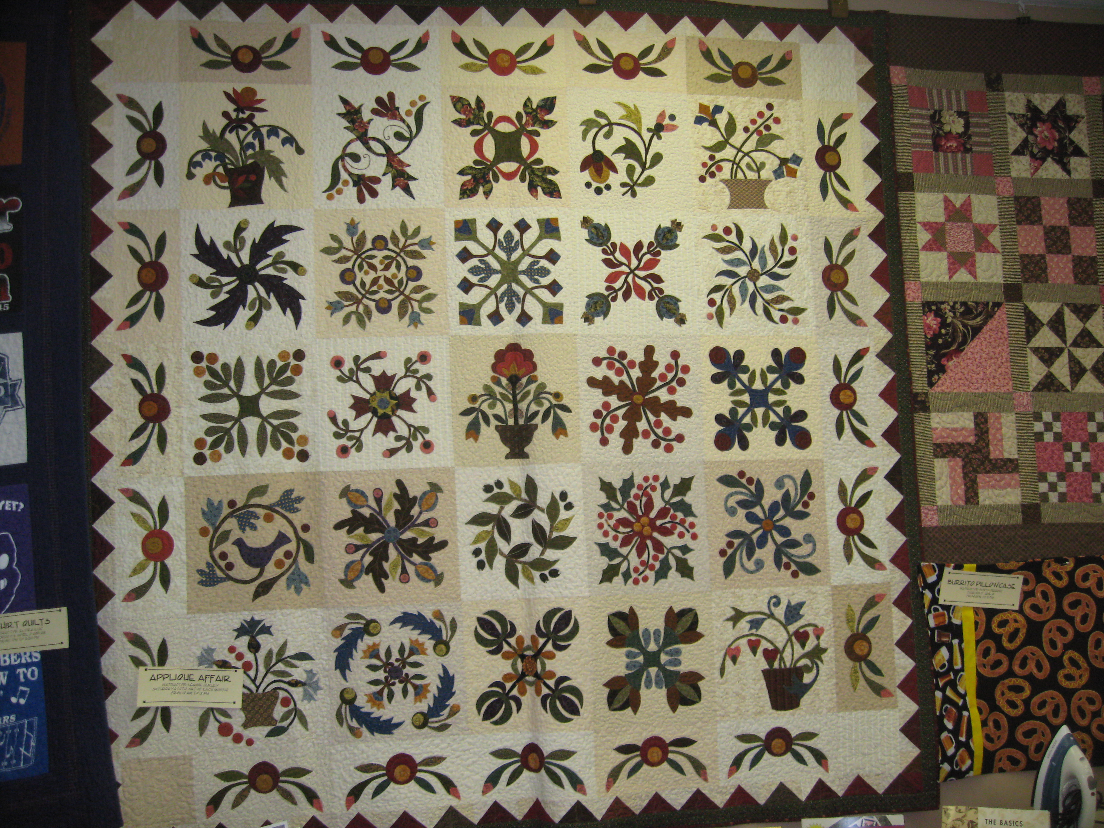 Last we headed over to Batavia & visited Prairie Shop Quilts. They always have great samples hanging in their shop.This is the shop where I learned to applique. This Piece O’ Cake applique was hanging in their classroom. Lucky for me, Shelley had this pattern so I can add yet another project to my to-do’s:)