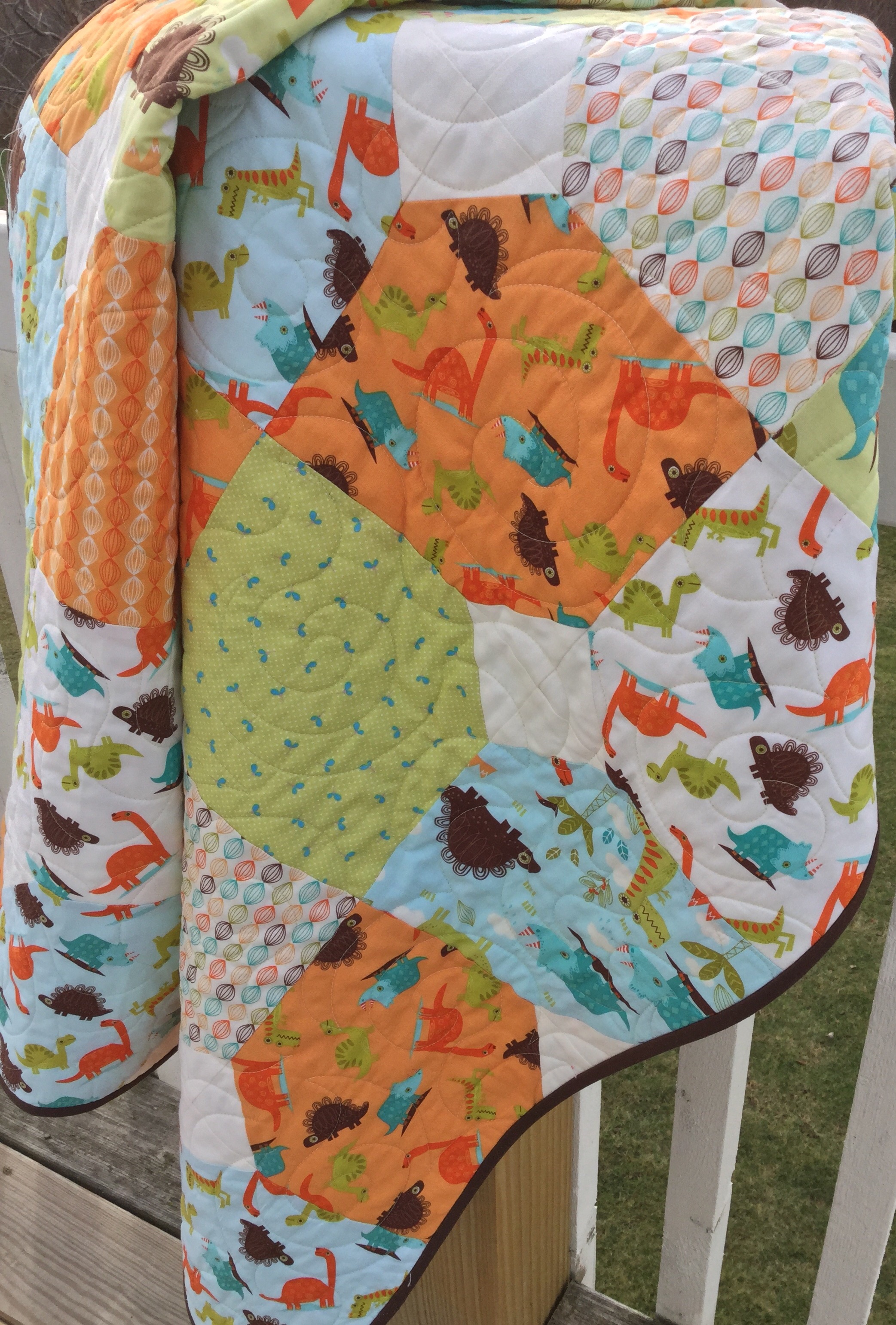 Dino-Roar uses 8 different fun prints in oranges, greens, browns & blues. There are Dinos tossed in different sizes, a sweet little leaf print and other coordinating Dino ‘egg’ prints. Kona Snow is used for the white. The binding ties it all together with Kona Chocolate.
