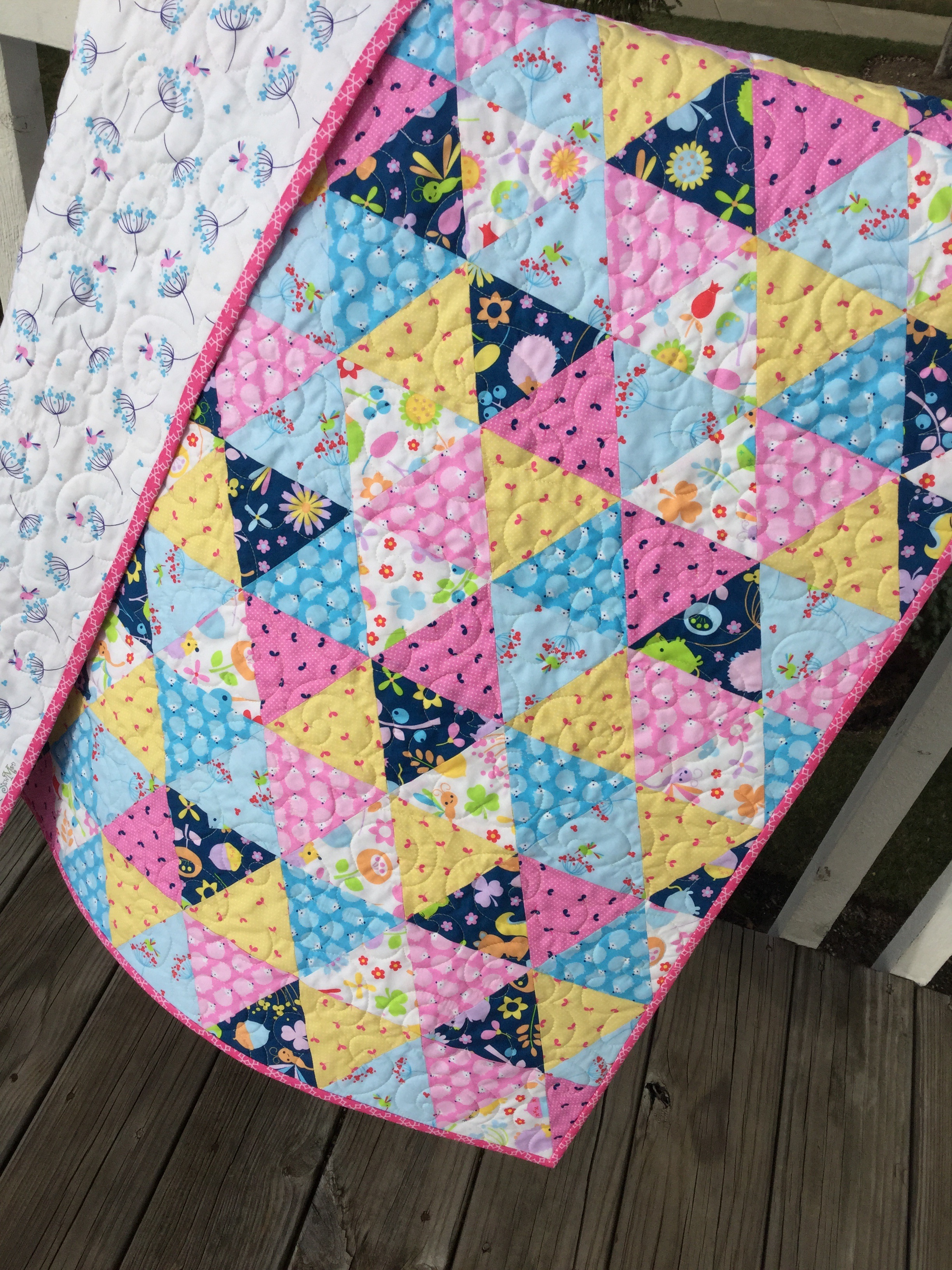 The quilt top colors of this KIT are bright pink, blues, and yellows. The backing is blue wildflowers on white with tiny pink birds tied all together with a hot pink binding.