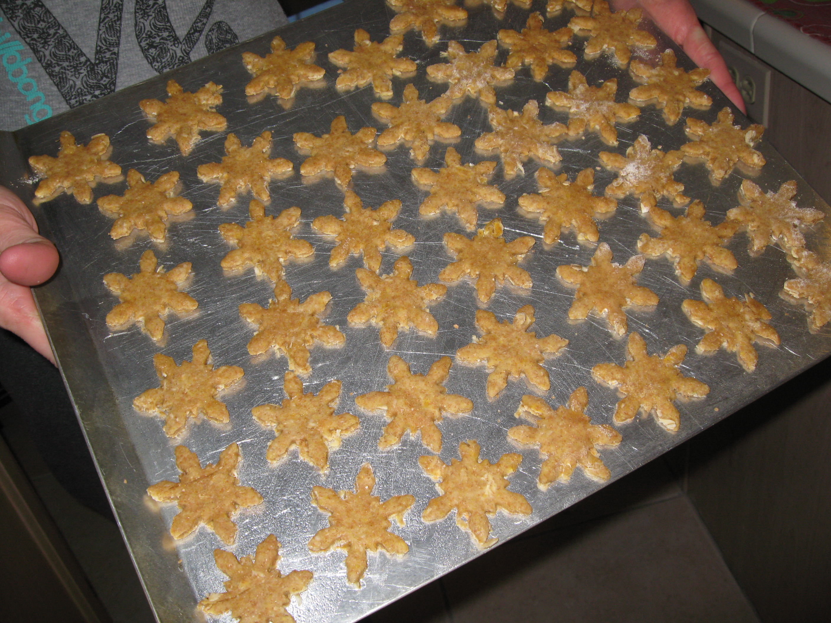 Mix all dry ingredients in bowl. Make a well and add wet ingredients. Mix and add water in gradually till moist but not wet. Roll onto floured surface. Cut with cookie cutters, we used bitty snowflakes, and place on lightly greased cookie sheets.