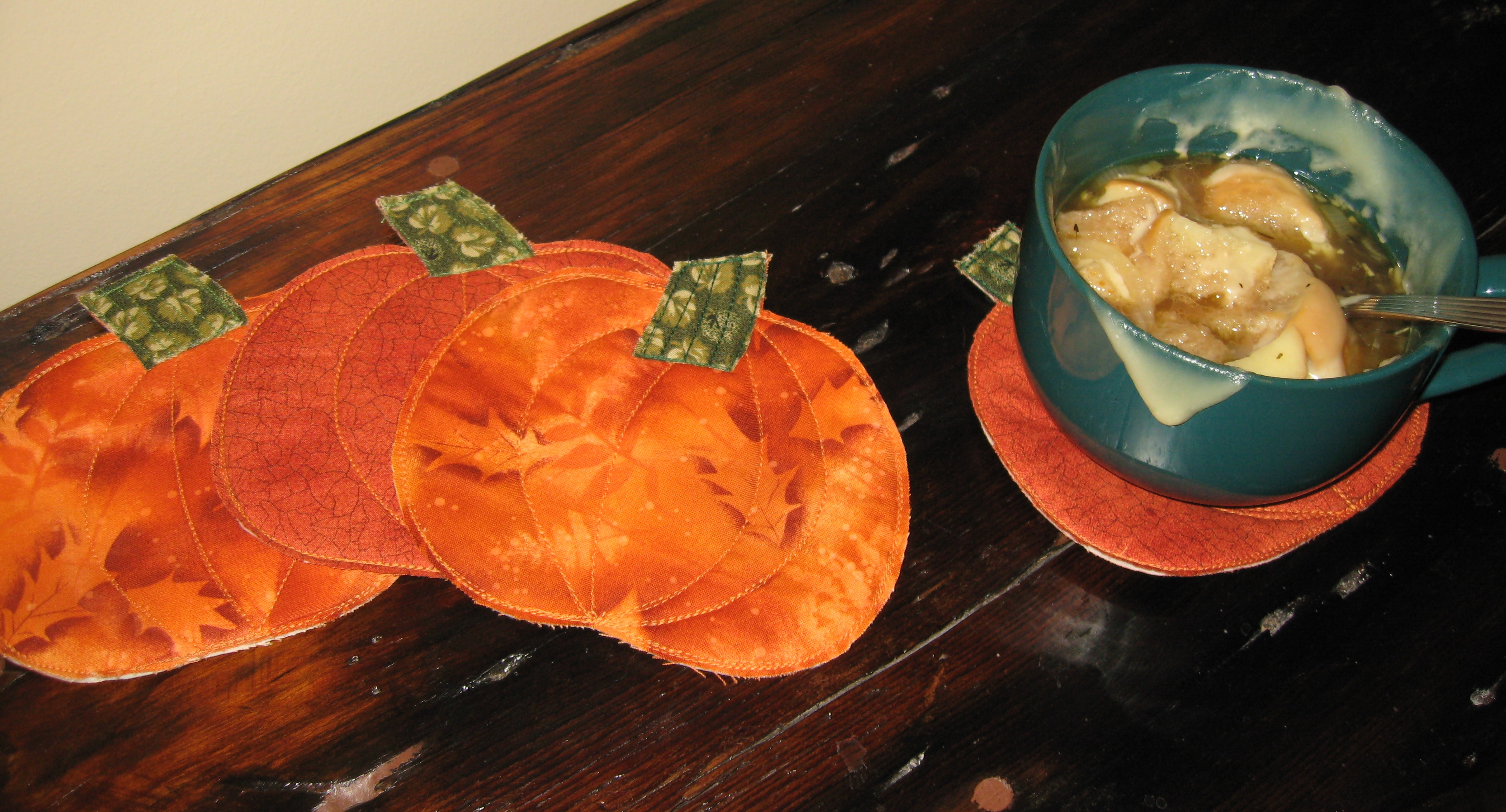 I love pouring over all the quilting blogs out there and seeing what everyone is up to. I found a cute idea at abrandiecreation.com. These cute little coasters would be a great hostess gift if you’re going to someone’s house for Thanksgiving, so I made some up. And if you’re wondering what it is I have in the bowl, it’s Paula Deen’s french onion soup…It was so, so good!