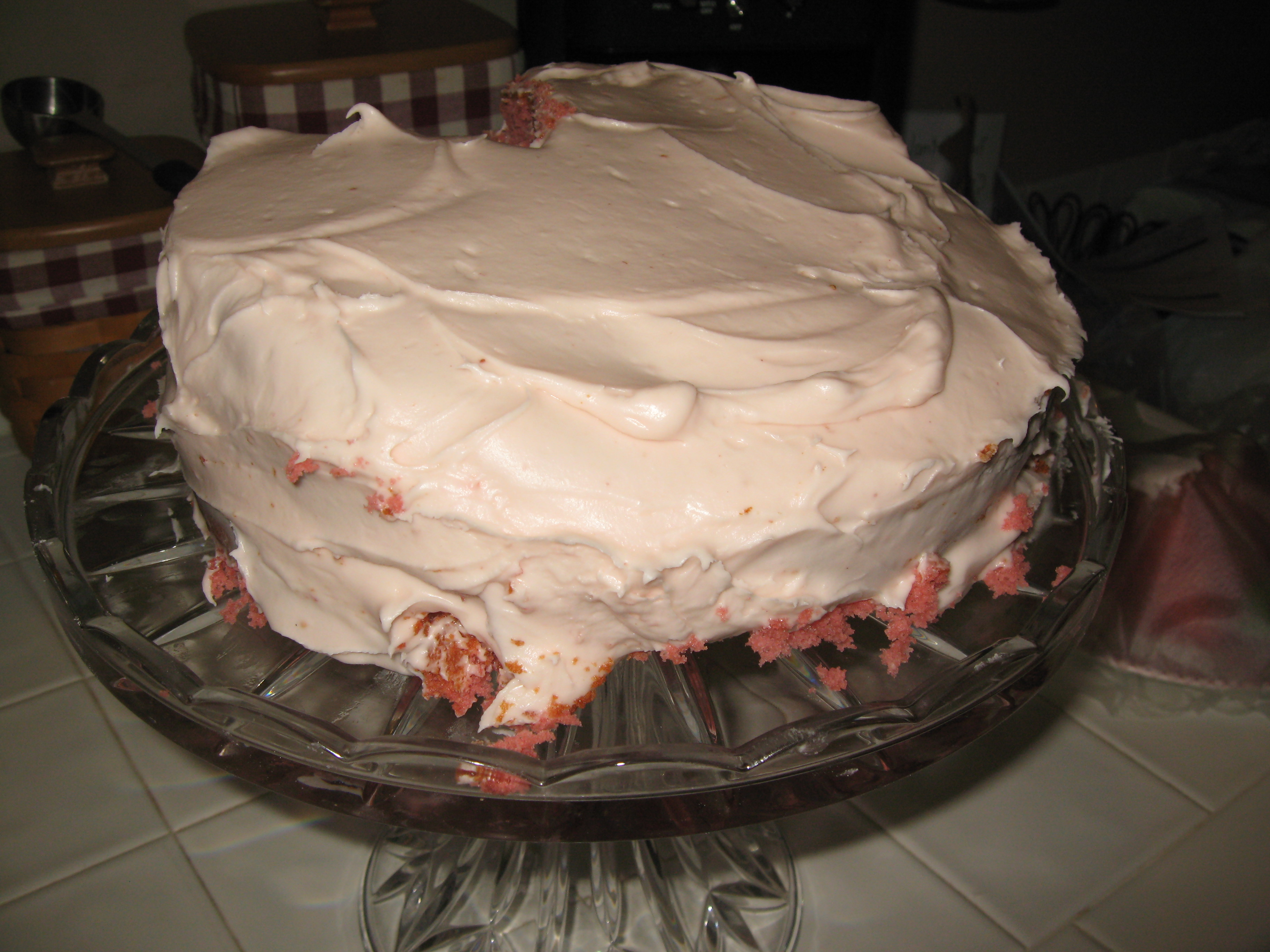 It turned out pretty, didn’t it? At least this piece did. I had a cake malfunction when I removed the wax paper from the bottom after icing it. The paper pulled the bottom of the cake off:(