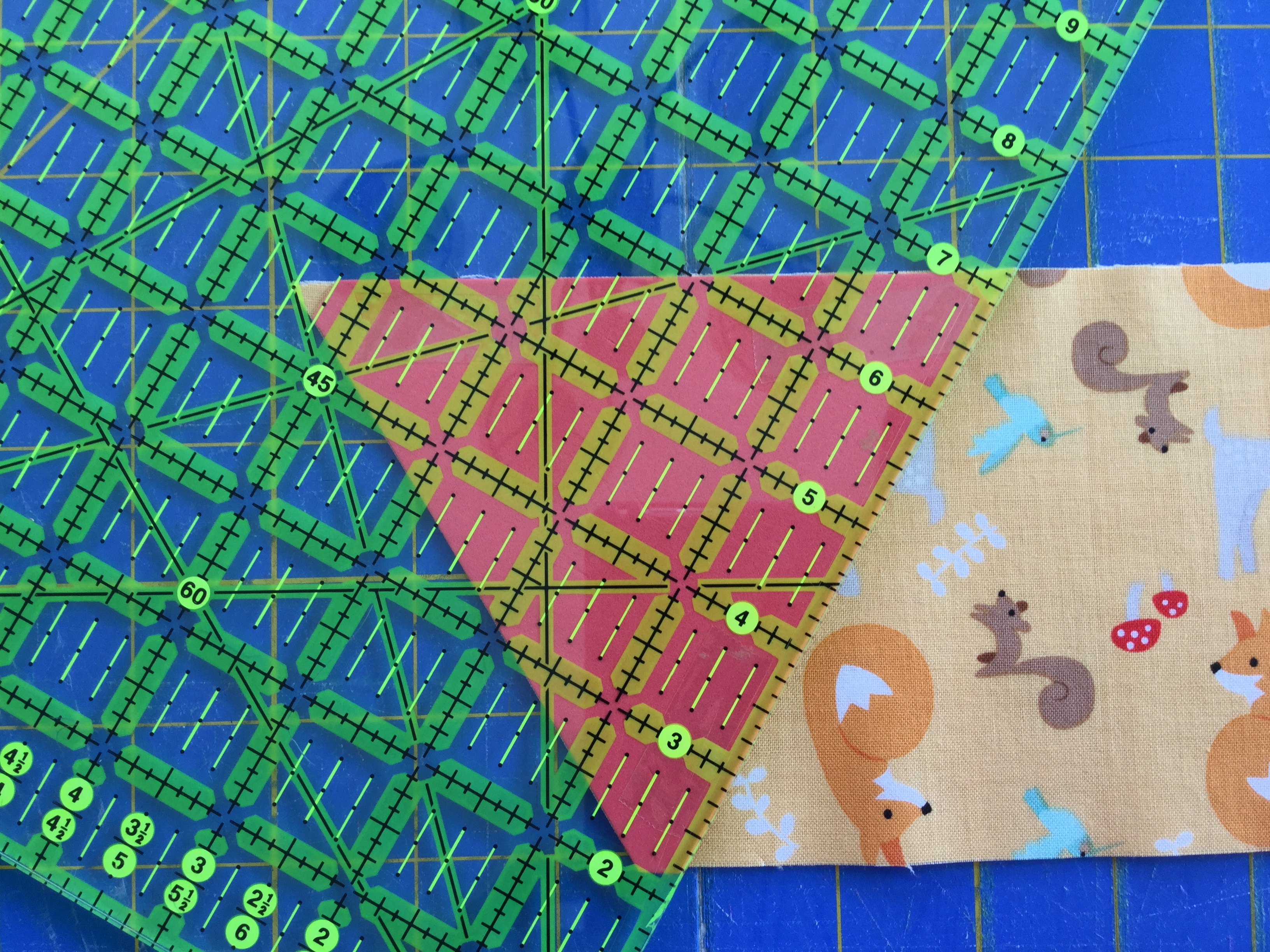 I wrote this ‘little‘ tutorial for a new baby quilt KIT for the shop using equilateral triangles and Riley Blake’s fabric line called ‘Good Natured”. It really is a sweet quilt with the orange & mint…adorable nature friends… squirrels, baby deer, sweet little bluebirds and playful foxes among birch trees!