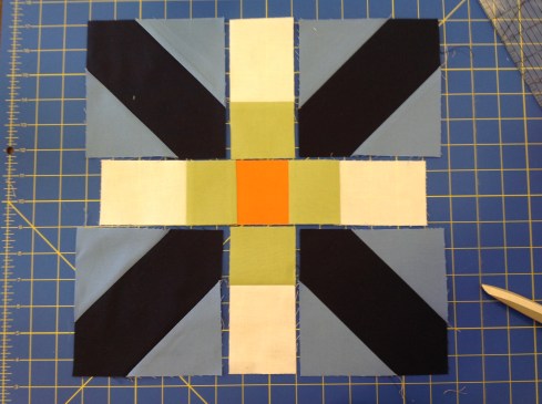 Lay out your block according to picture and begin by sewing the X blocks to either side of the green/white units. Press to the right. Finish by sewing the rows to the top and bottom of the middle white/green/orange unit.