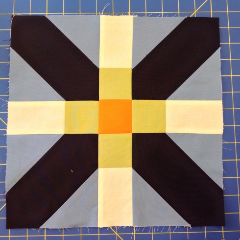 The Crystal Lake Modern Quilt Guild is doing a BOM quilt and some of the members are helping out by doing the demo on each one. Our demo was the “X and +” block. The demos are done in all the same colors, which are our CLMQG logo colors, but each member can make their own version. Should be interesting to see what everyone comes up with since we all have so many different styles. The demo quilt blocks will be put together and raffled off after we’re all finished.