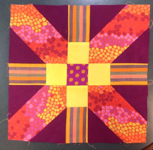 This is the one we are adding to our BOM quilt. Paige picked out a variety of hand dyes, modern plaids, and Kaffe fabrics. It’s going to be wild, crazy modern and I am excited to put this together! Check back often to see our other blocks from the quilt.