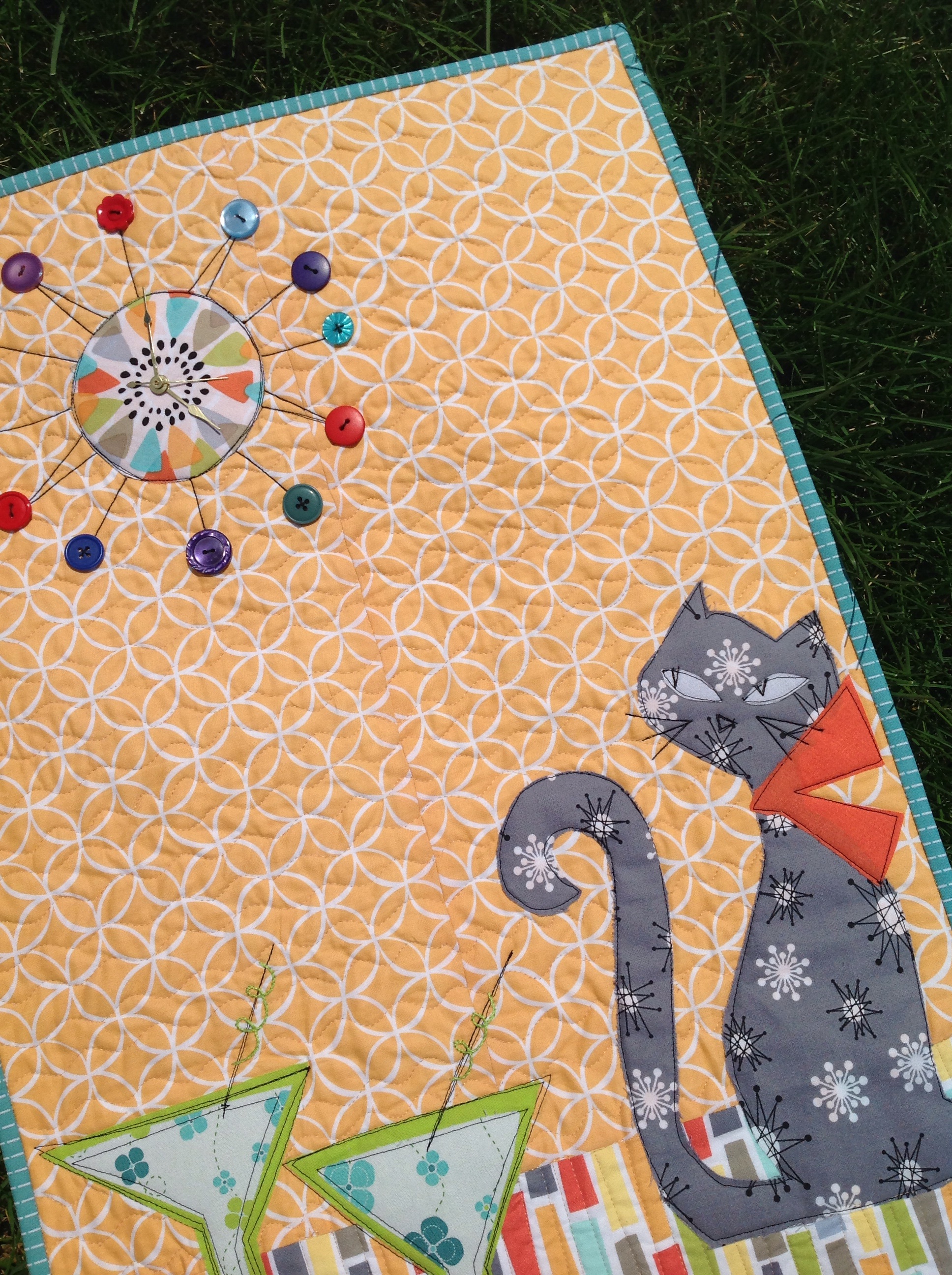 Once I started sewing, I told myself the story. What’s kitty staring at the clock for? Cocktail time, of course! It’s five o’clock and she’s a Cosmo Kitty! So I added a couple of martini glasses.