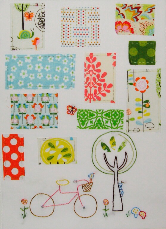 These 2 bolts are so cute. The Happier main has a whole scene going on if you look closely. Birds, butterflies, caterpillars. I just knew when this arrived that I had to embroidery something. I immediately thought how nice it would be to ride my bike along this fabric, so I jotted down some ideas and used the tree and critters as inspiration.