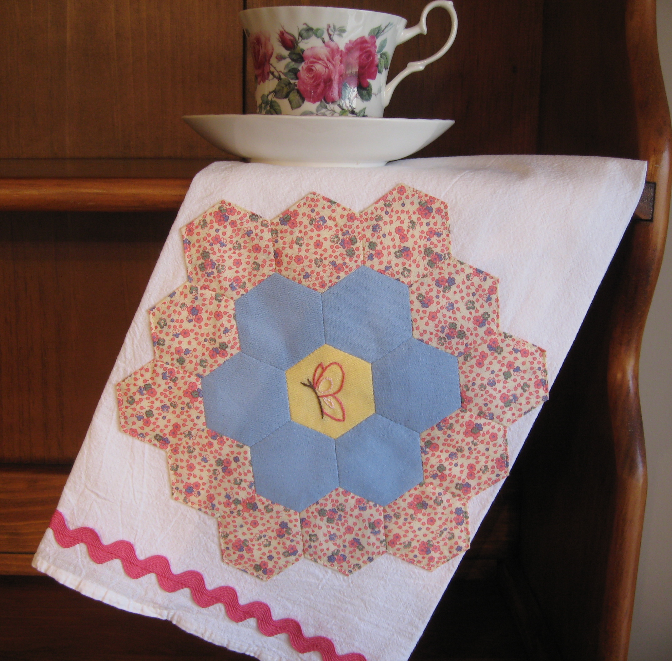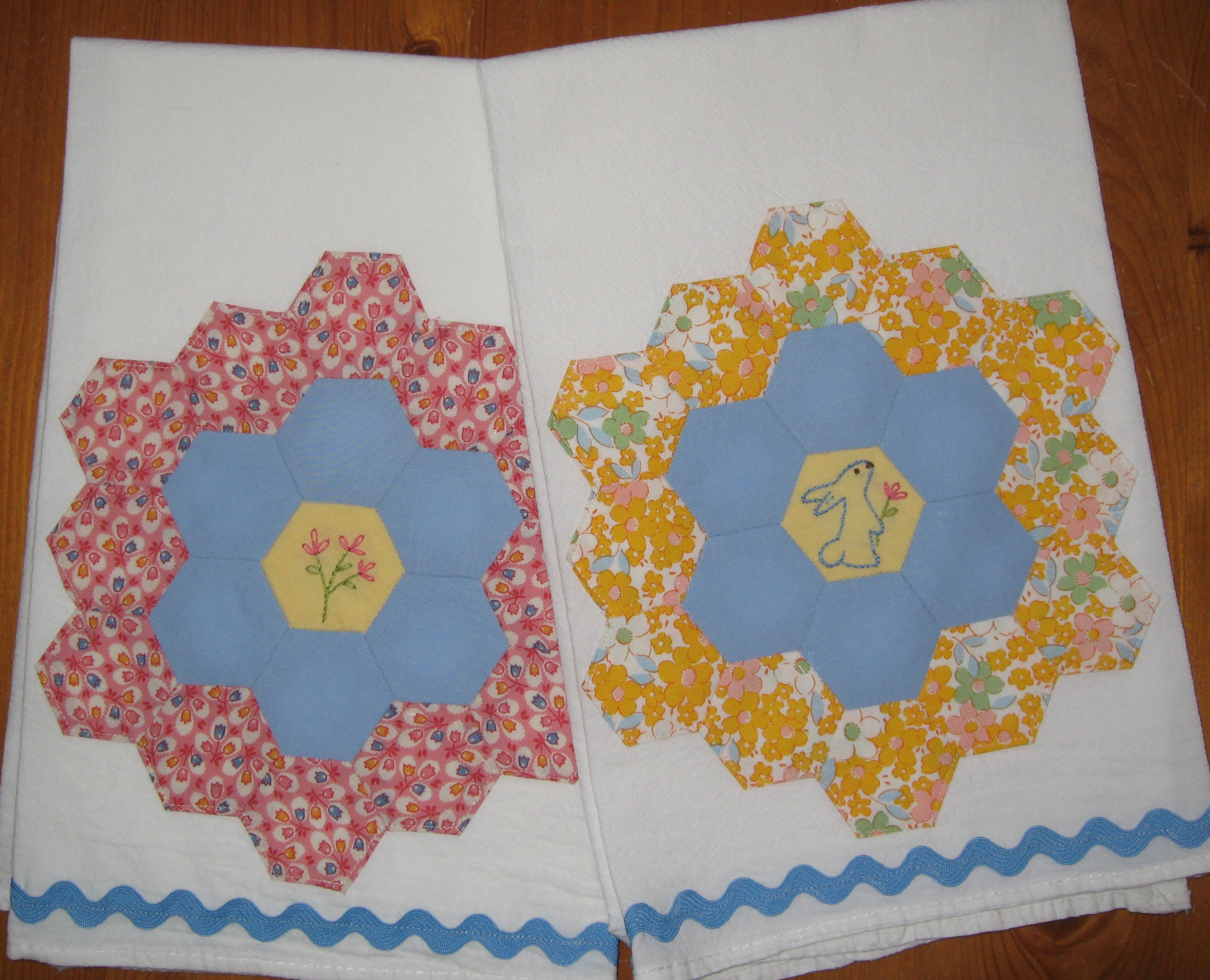 Yesterday, Jeanne, my Oklahoma Sista from my Flickr Tea Group asked us how our spring projects were going. Well, Jeanne here’s what I’ve been doing and I’d have to say they are going pretty well. I made these cute tea towels with some of my leftover Grandmother’s Flower Garden blocks.