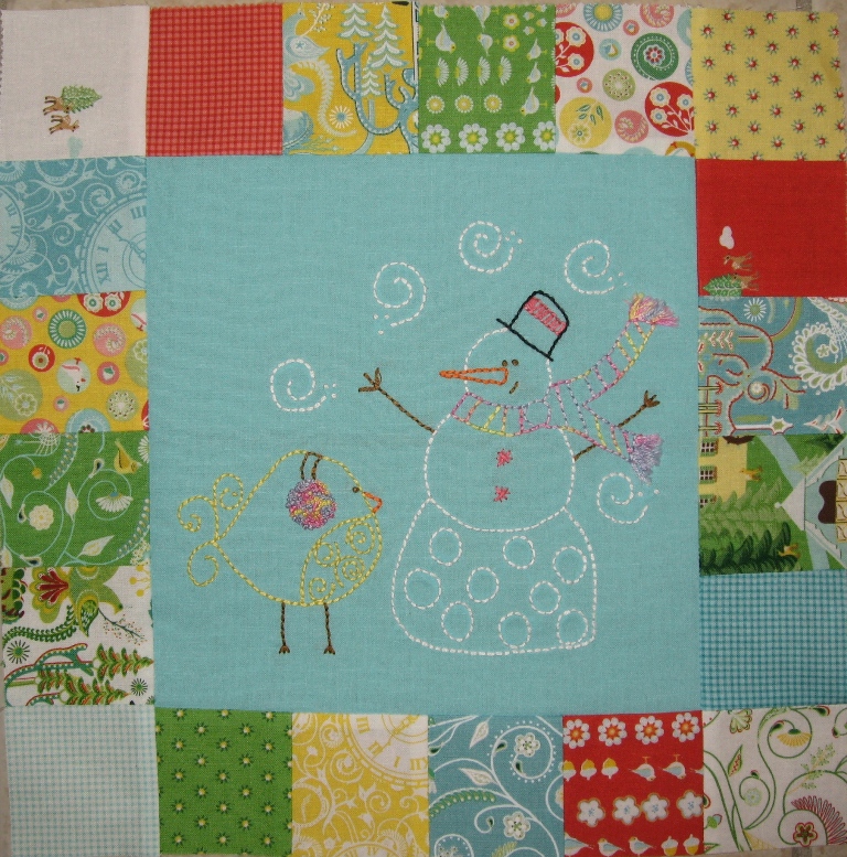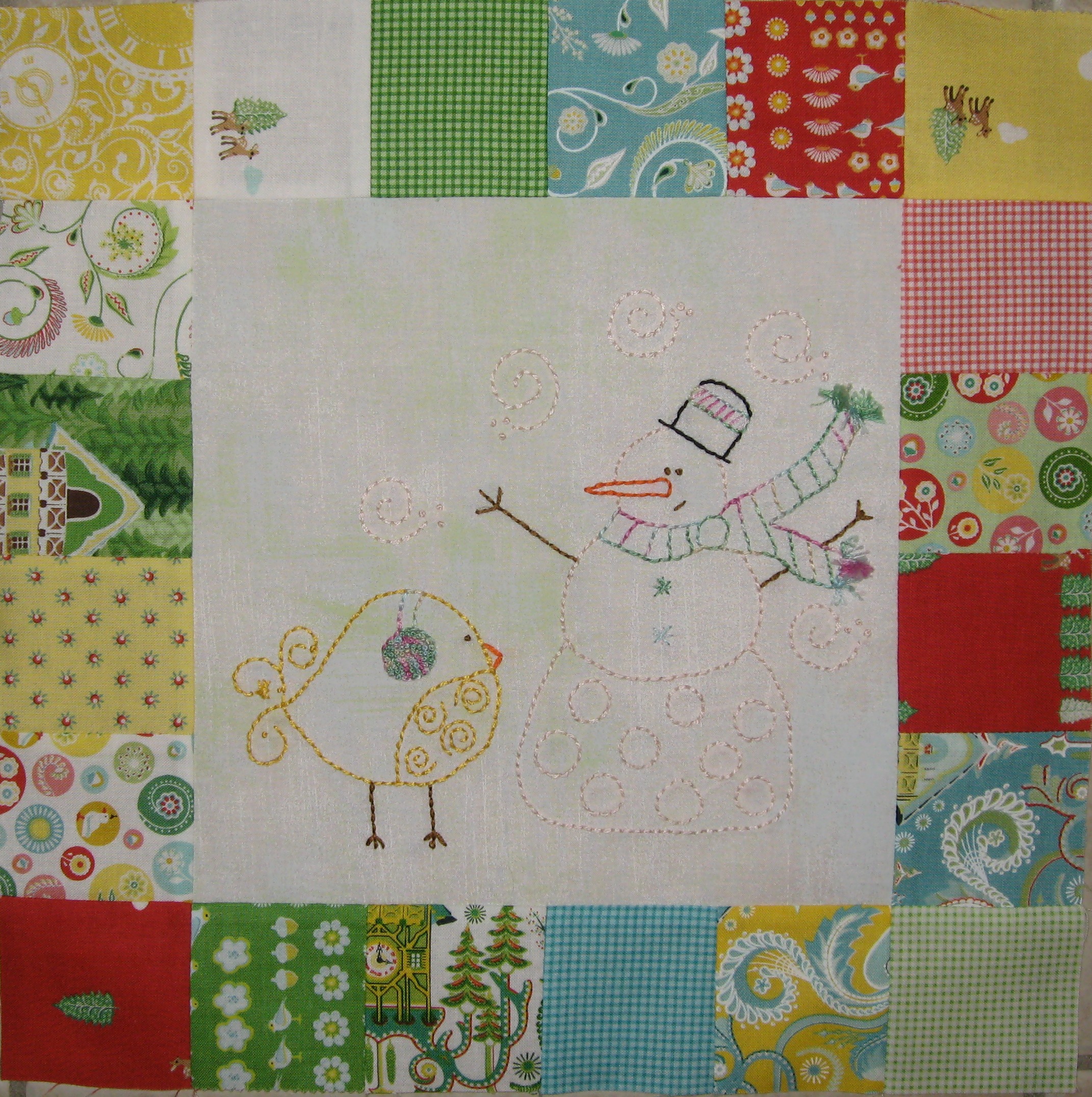 This time I used Moda’s Grunge in white. I like this version much better. I do wish I’d done the snowman in a darker pink and when all is said and done, I’m sure this block will be on its 3rd version. I’m just that way. I want it perfect!