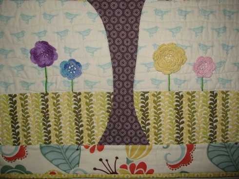 I found the perfect background in my stash, cute little birdies! And I’d have to say some pretty perfect grass! I added some little crochet flowers and green embroidery to spruce it up. I even added french knots in the border along some of the orange flowers.
