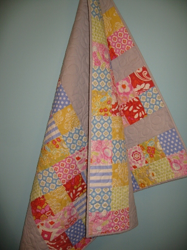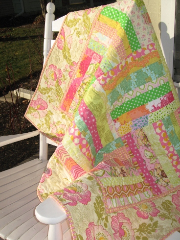 Candy Jar is a quilt for sale now in the Etsy shop. It’s made with a lot of Amy Butler fabric. Paige quilted this one on her longarm and the binding is hand stitched to the back. Very girly!