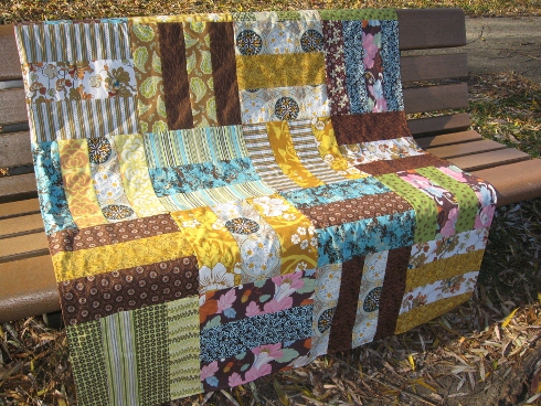 These quilts are easy to assemble using mostly 3-1/2 ” to 4-1/2″ strips pieced together to make a 12-1/2″ block. Alternating the directions of the blocks adds interest. These quilts can be made any size by adding as many blocks as you have fabric for or adding borders. They can be quilted or put some Minky on the back, turn it inside out and tie it off with embroidery floss for a quick gift. We even used the leftovers for the backing.
