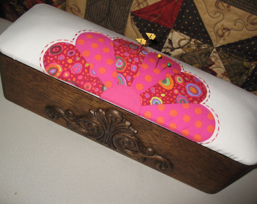 I’ve got a couple more boxes. I’m working on another one with the hand quilted Grandmother’s Flower Garden & a GFG block that’s appliqued on yellow plaid. That one is turning out cute, cute!