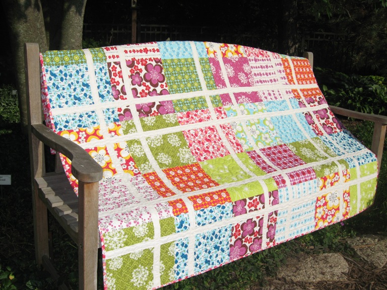 Everywhere we looked we saw perfect areas to drape a quilt, so we asked permission to come back and take pics. We had just finished up with one of our shop samples from the Pick A Bunch line. What better quilt to display in a flower garden than a sweet little quilt with colorful daisies on it.