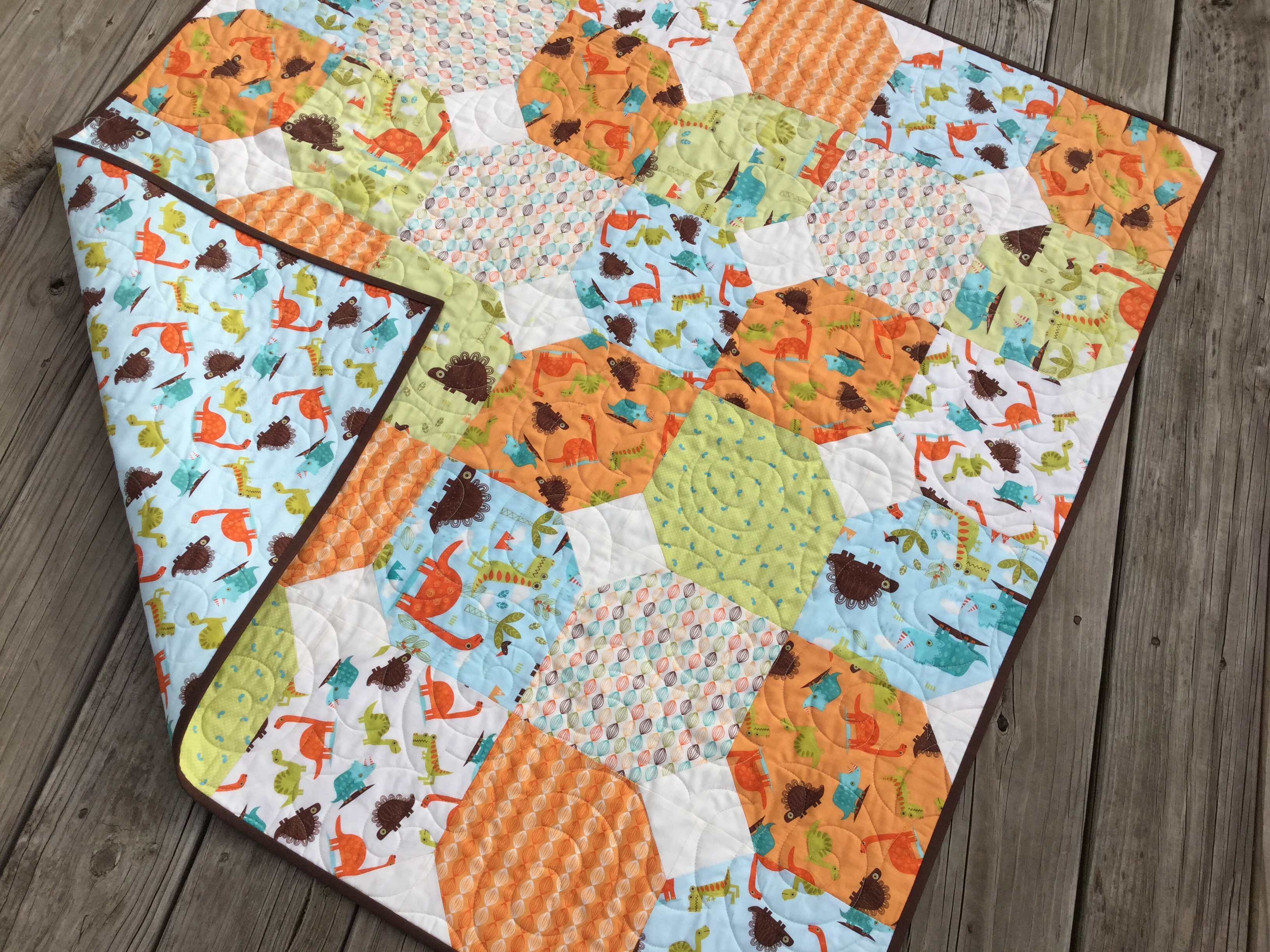 Dino-Roar uses 8 different fun prints in oranges, greens, browns & blues. There are Dinos tossed in different sizes, a sweet little leaf print and other coordinating Dino ‘egg’ prints. Kona Snow is used for the white. The binding ties it all together with Kona Chocolate.