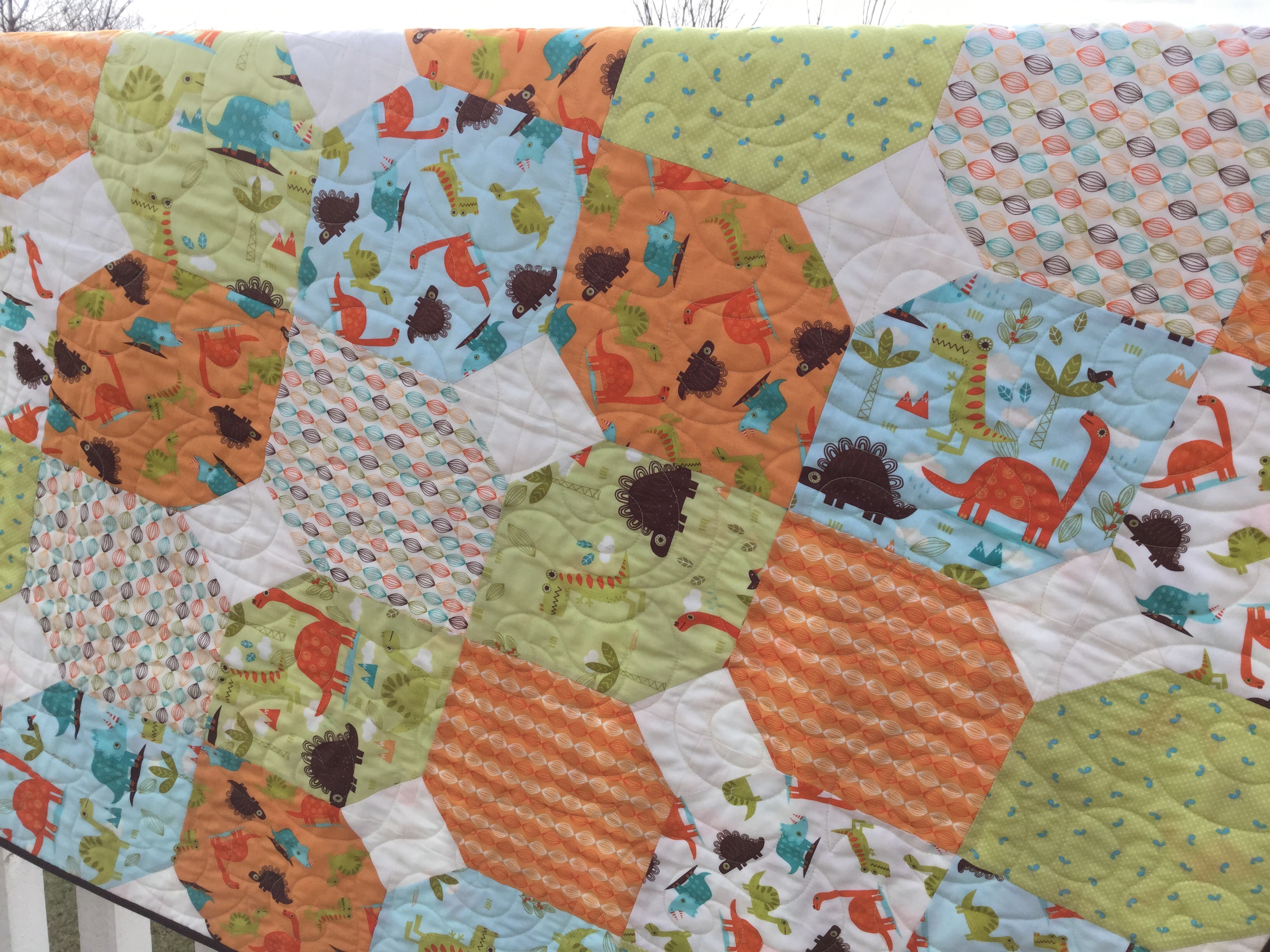 Dino-Roar measures 45″ x 45″ and is a complete kit as well including the backing, binding and free pattern. $55 plus shipping.