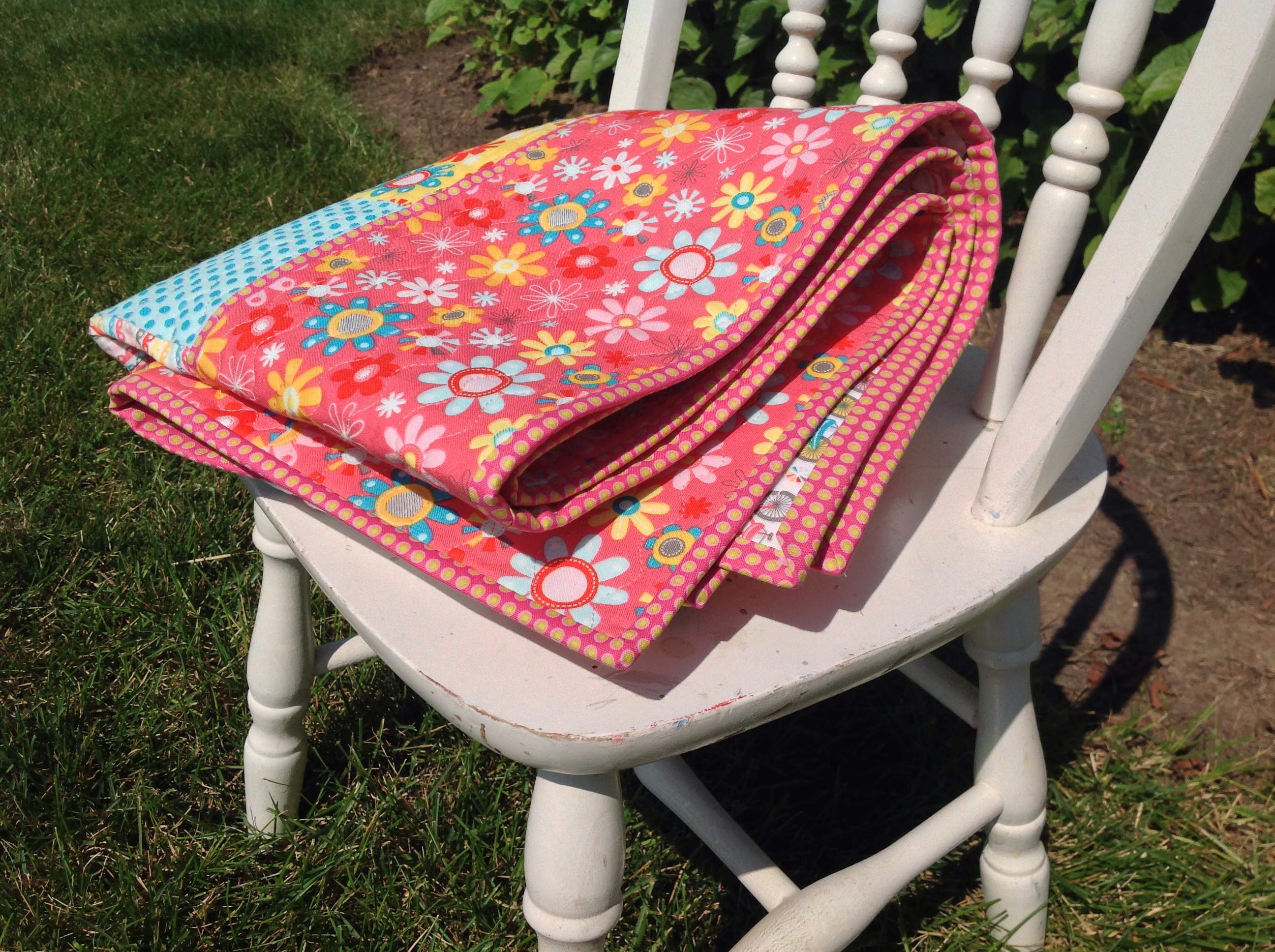 The border fabric has pink, yellow & blue daisies and the backing is fun bicycles!