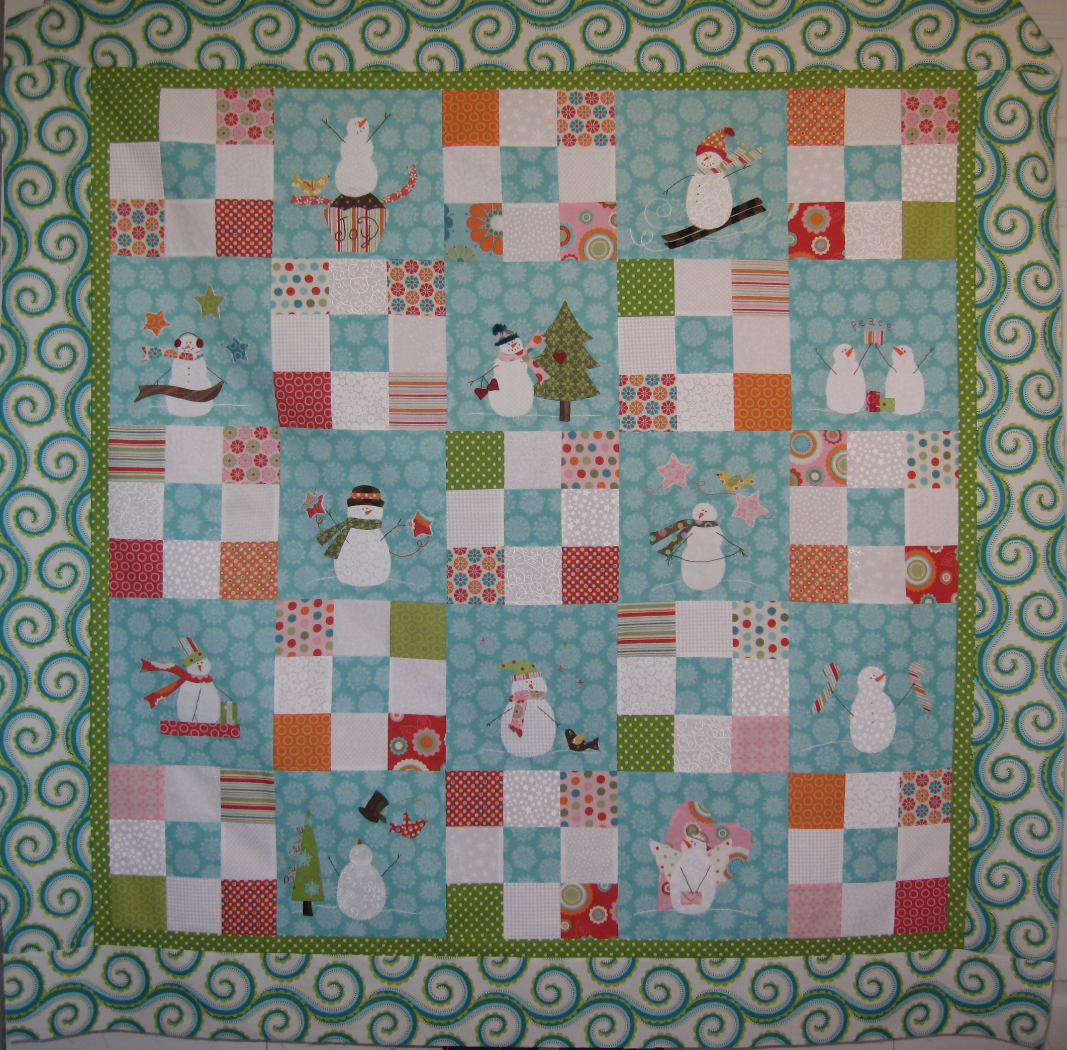 I finally finished my Snowbound quilt and only a day behind schedule. I decided against the chain blocks because they competed too much with the snowmen. I thought a simple scrappy nine patch worked best. The only image I see when I look at this quilt is a swirly, yummy lollipop. It has all the colors…pretty fun, huh?