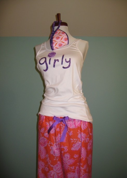 We purchased a few dress forms a couple of months ago and I’ve been jonesing to fancy her up a bit. I knew exactly what I wanted to do and use…a Honey Child ensemble of p.j.’s, slippers, eye mask, and a cute tee, and I wanted it to be very Girly!