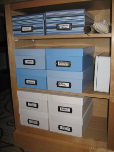 The black boxes are from Ikea and have labels on them using a P-Touch label maker. This is where she keeps all her projects.