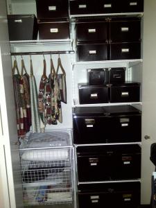 She has a closet outfitted with the Elfa system from The Container Store. It can be designed for any closet and is easily rearranged if needed. I have an Elfa system in my bedroom closet and I love mine too. I wish I had one for my sewing closet….see, the envy is already starting:)