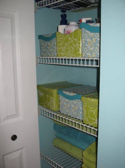 And I organized the storage in the restroom with the tubs I found at Wal-mart on my last shopping trip. And yes, every time I change a bathroom, I need to have matching towels. It’s a bit obsessive, I know:)