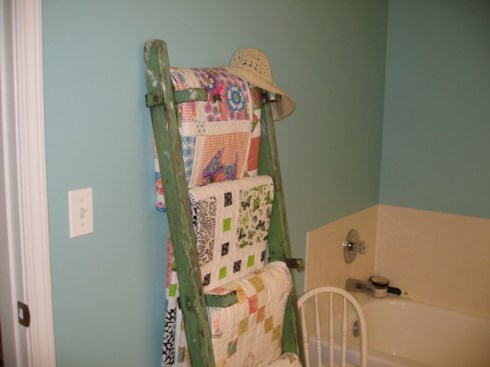 I moved the quilt rack in there. I like seeing them while I put my makeup on. It makes me happy.