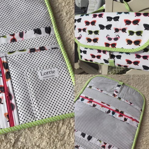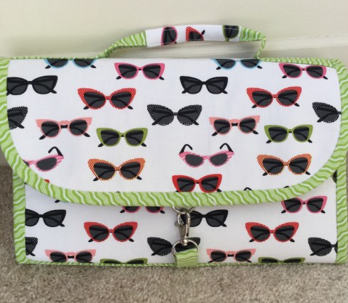 Made with Riley Blake’s retro Sunglasses fabric and coordinating crimped green binding. And how cute are those tiny black hearts for my inside?…swoon…