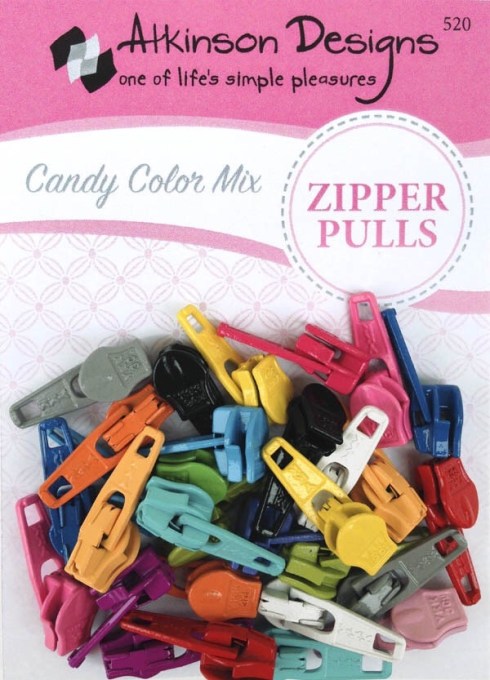 This technique works with the Atkinson zippers and pulls and we have the colorful pulls in stock in the shop! The package comes with about 30 pulls to mix and match with your zippers.
