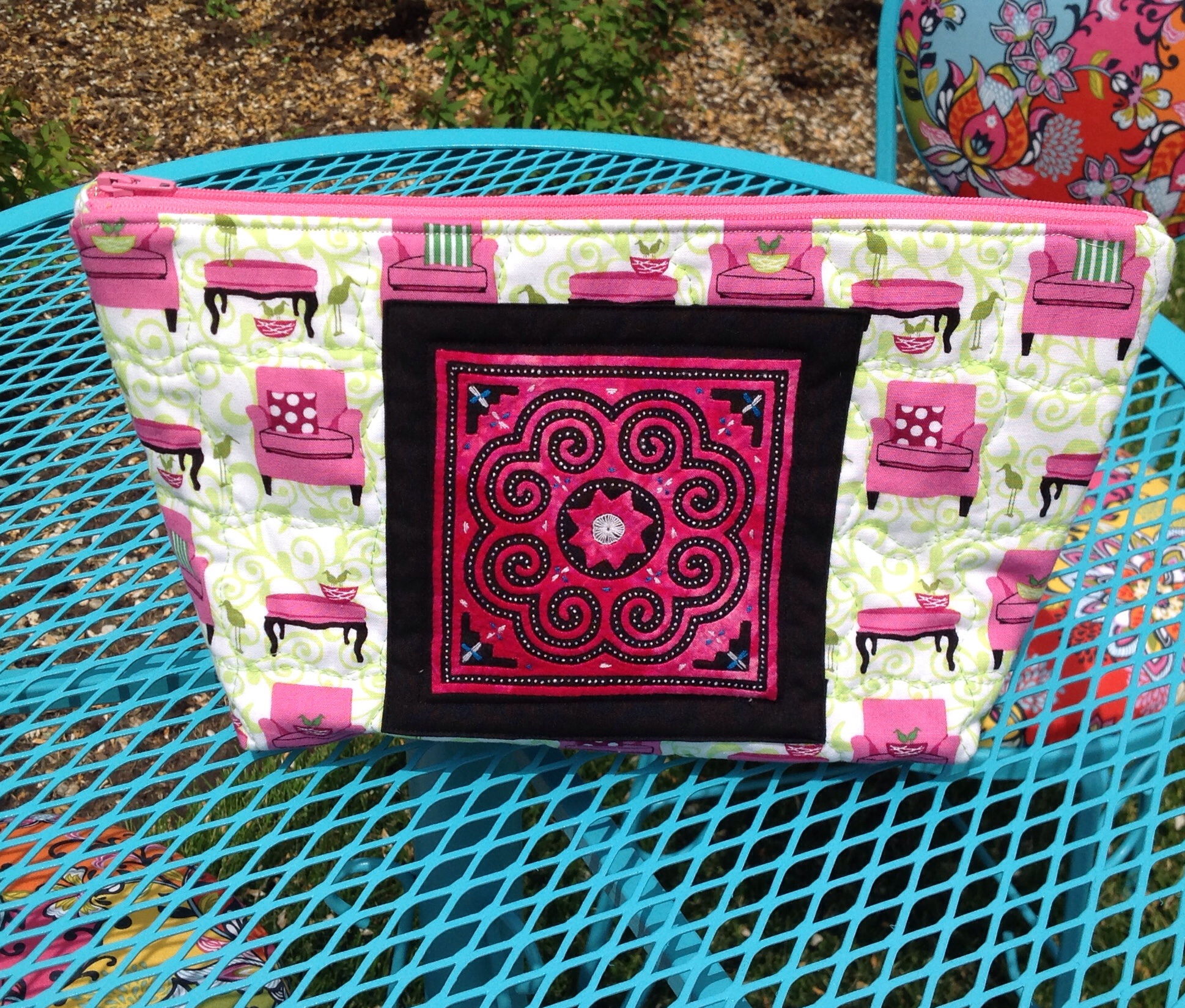 Mine was inspired by a tutorial found here. I added fusible interfacing to all the parts and didn’t bind mine but instead turned in the sides and top stitched.