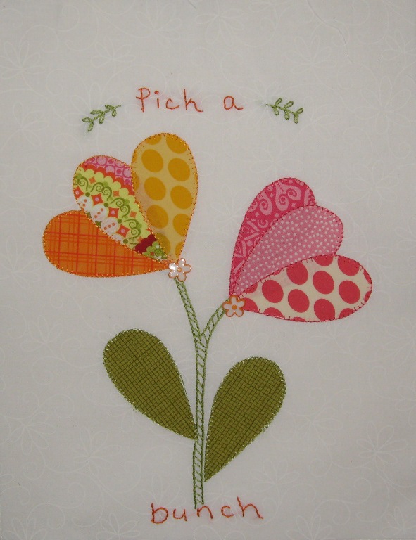 April was Diane’s month, some of you know her by Mimi’sdarlins. She designed this cute flower applique that can be made into a pillow or whatever you choose. I chose to machine applique the flowers, embroidery the stems and add a Pick-a-Bunch saying.
