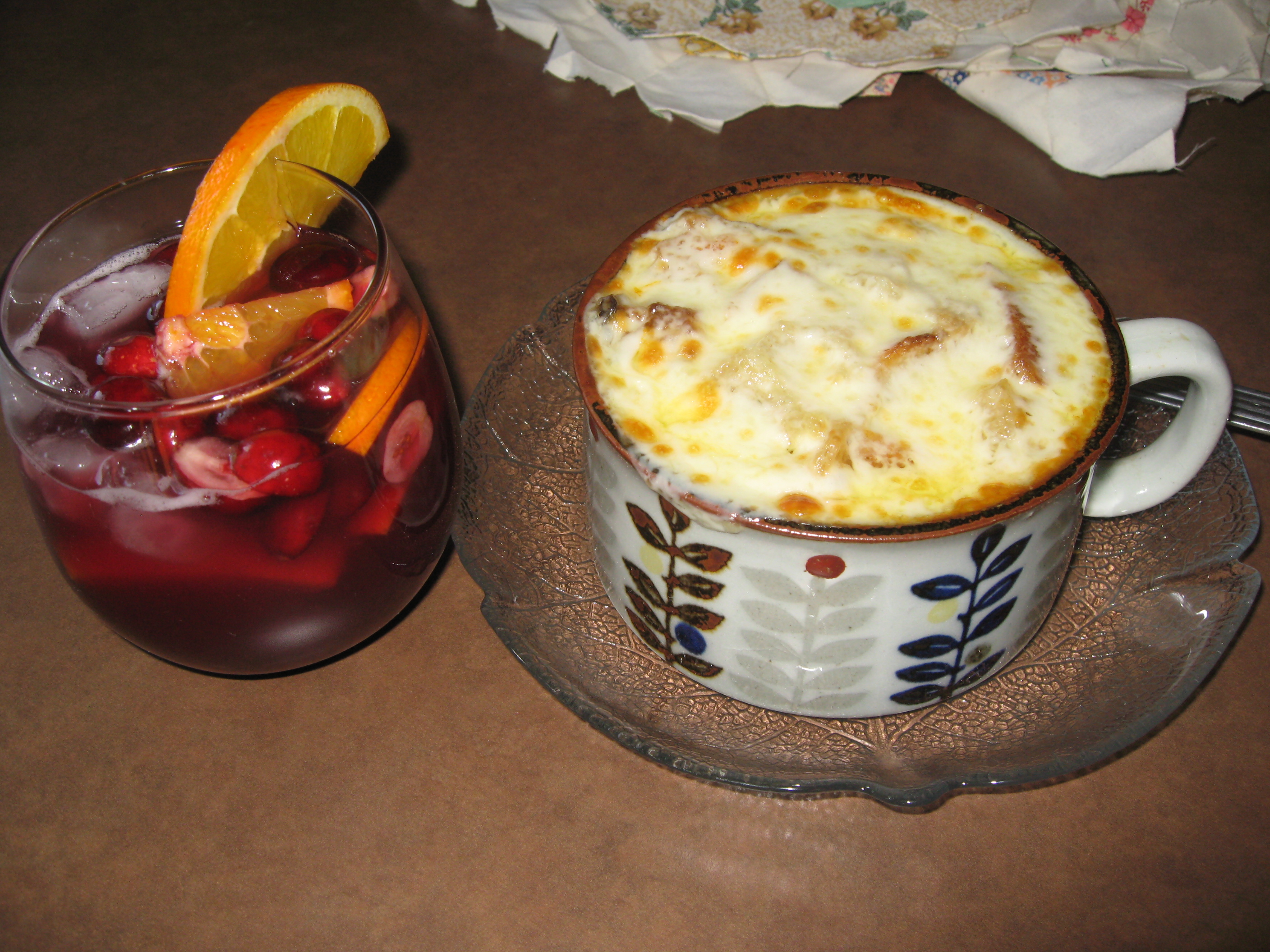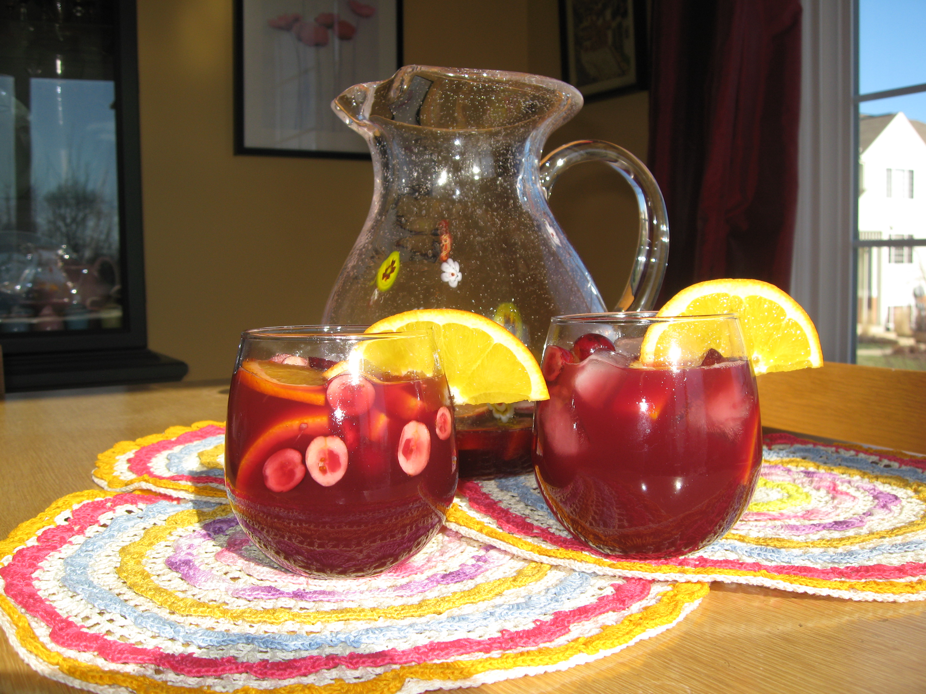 Lorrie and I were working hard on some projects last Sunday – the air was cold but the sun was warm and bright. It was time for lunch we planned on homemade French Onion soup but we needed something to calm the onions and quench our thirst! I made up this festive drink using Frontera Cranberry Sangria mix, a red Zinfandel by Blackstone, fresh cranberries and orange slices…YUM!!! The glass pitcher and mix are both from Crate & Barrel and they are resting upon hand crocheted placemats I picked up years ago at a resale shop -don’t they go perfectly together. What a beautiful color cranberry is!