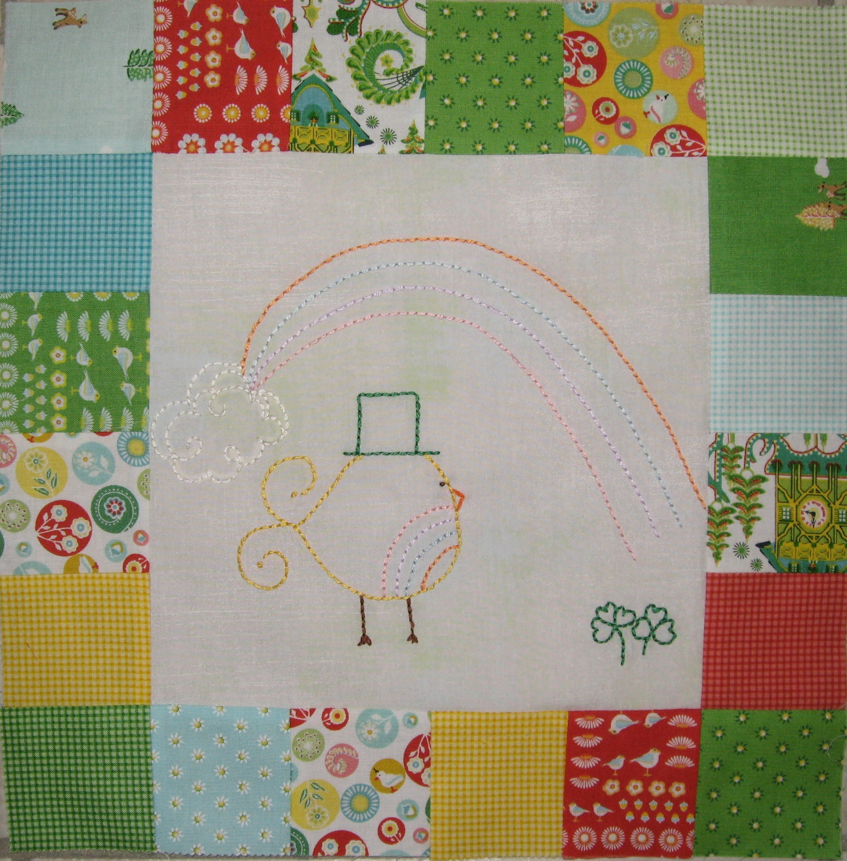 I modified the Birdie Stitches block 3 just a bit. I couldn’t help but add some shamrocks and a leprechaun hat to the bird.