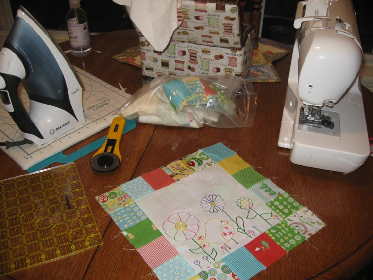 My Birdie block for May is finally finished! I snagged one of my sewing machines and other necessities from under the paint tarp and set up shop “old school” on my kitchen table. It doesn’t bother me to sew there, except the table’s too high and my back starts to ache from stretching…or maybe it aches from having to use the proper posture to reach the machine.