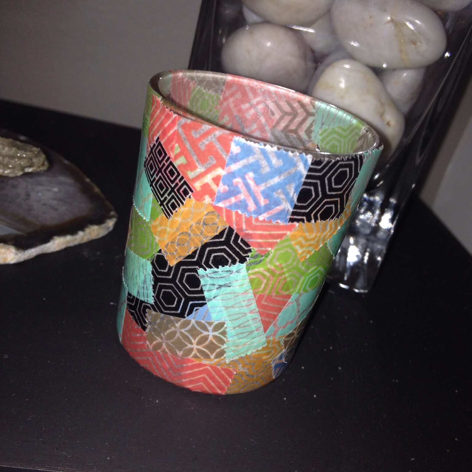 What should I do with Washi Tape? It’s all the crafty craze on Pinterest. I even have an entire board dedicated to the idea. Any surface is pretty much up for grabs! Decorate any glass or wood, light switches, vases etc. And since it can be repositioned, it doesn’t leave residue behind. We’ve even put different tapes on wine glasses at parties so we can keep up with whose is whose.