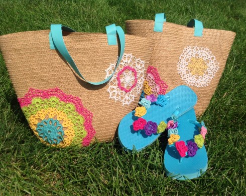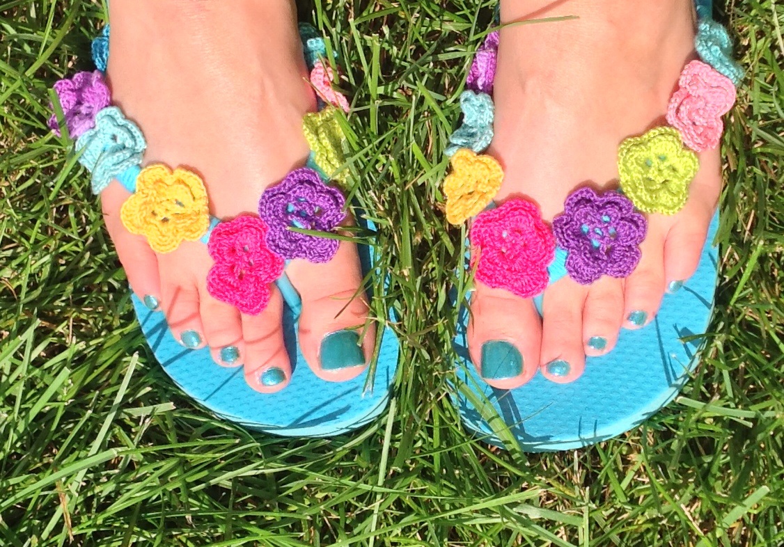 I didn’t stop with the totes. I took dollar store flip flops, crocheted flowers, and a bit of blue yarn..