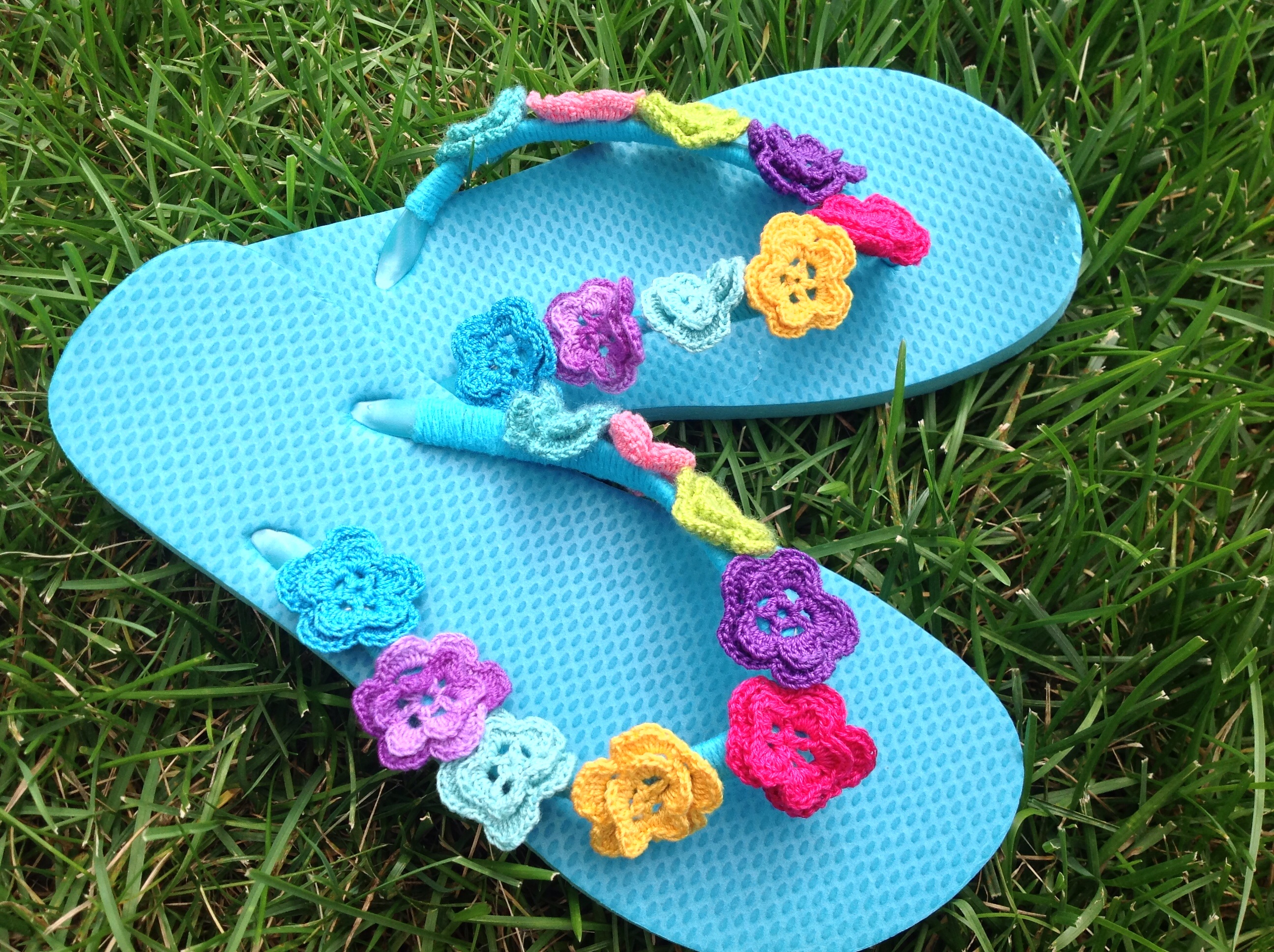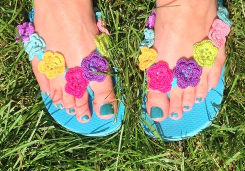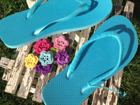 All I did was wrap the flip flops with the blue yarn and hand sew the flowers on…easy peasy!