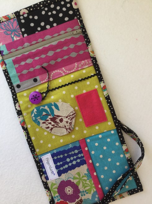 I used all of the girly fabrics I like. The front and inside is Riley Blake’s retro Dresses fabric, my pocket is a bicycle print with flowers overflowing from the baskets, and of course, some polka dots! Whenever I take my quilts on a car trip for binding I always travel with the bobbin instead of the spool. So on mine, I added a piece of tiny ric rac and a button wrap closure instead of the Velcro thread holder which suits your Aurifil spool nicely.