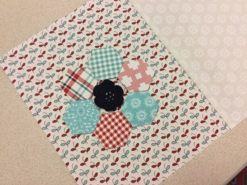 This design is so flexible and forgiving. Each of the girls work was unique. For example…A few of the girls decided to leave out their center hexie and let the flower be the focus and the background fabric shine through.