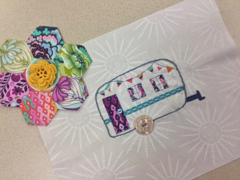The Patchwork Glamper is a fun way to incorporate all those trims, buttons and embellishments you’ve been stashing and a great way to learn many skills like English Paper Piecing (EPP) hexagons and embroidery with low commitment.