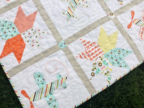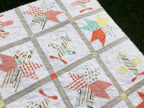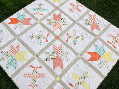 At first this quilt was just going to be a simple star to star block. No bells and no whistles. But how much fun would that be? I love appliqué. I love embroidery. I replicated the plane from the Oh Boy main fabric, positioned the planes horizontally and diagonally to give it the soaring effect through the quilt.